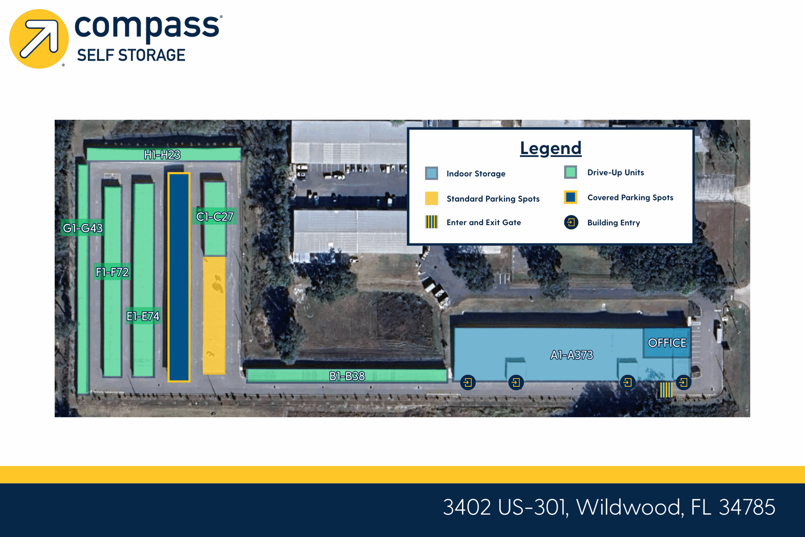 The new Compass Self Storage off of 301 in Wildwood FL, is a very clean facility and the staff are very pleasant and professional. They answer all of your questions.