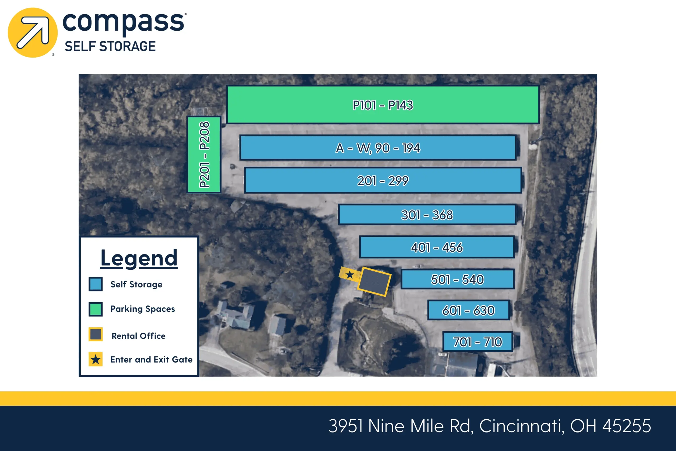 We’re committed to enhancing your storage experience. That’s why Compass Self Storage in eastern Cincinnati offers top-notch amenities such as 24-hour digital video recording, electronic gate access, and an on-site resident manager. Other features we proudly provide at our facility include:
