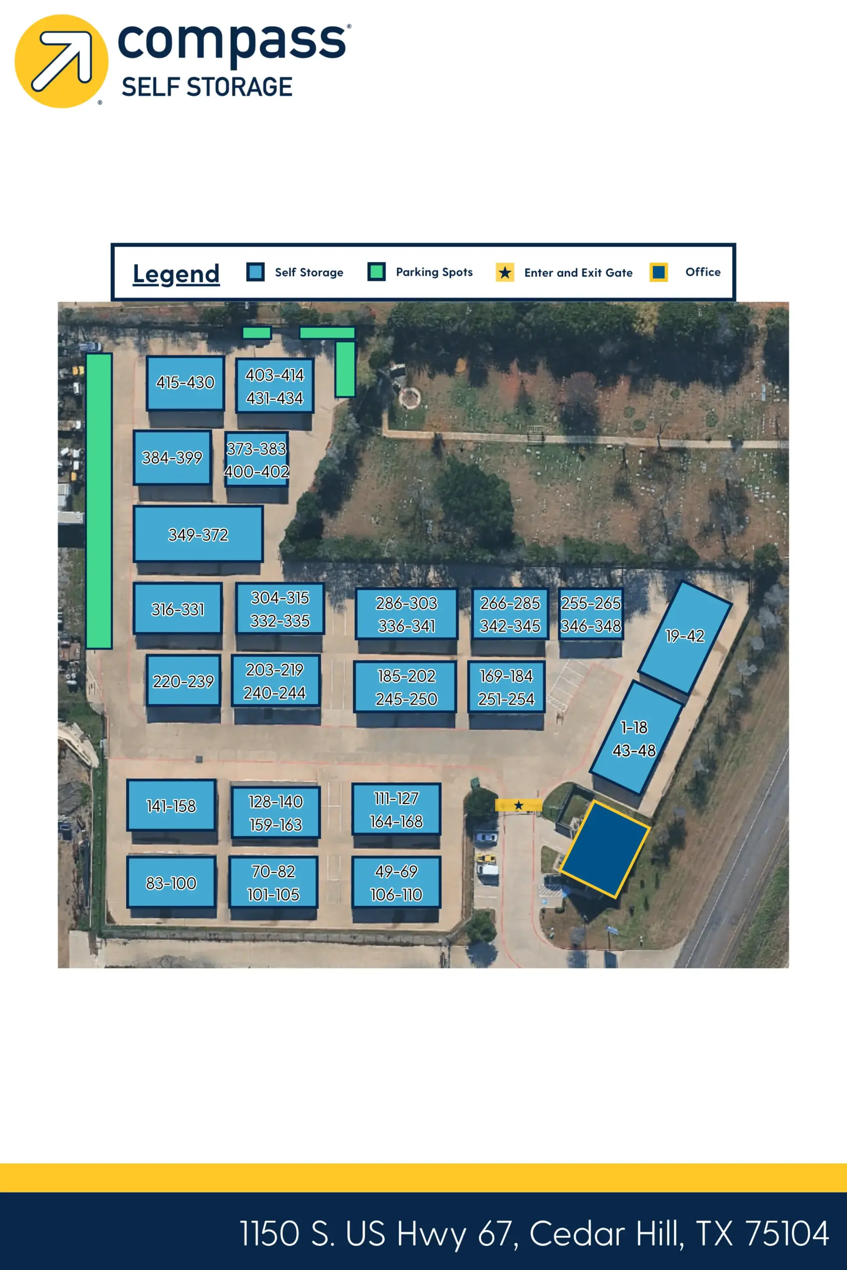 Are you looking for a convenient place to store your stuff? Compass Self Storage in Cedar Hill is close to Glenn Heights and DeSoto, making it a great choice for anyone nearby. Our location near U.S. Highway 67 is simple to find if you’re cleaning out your house or need more room for your business.