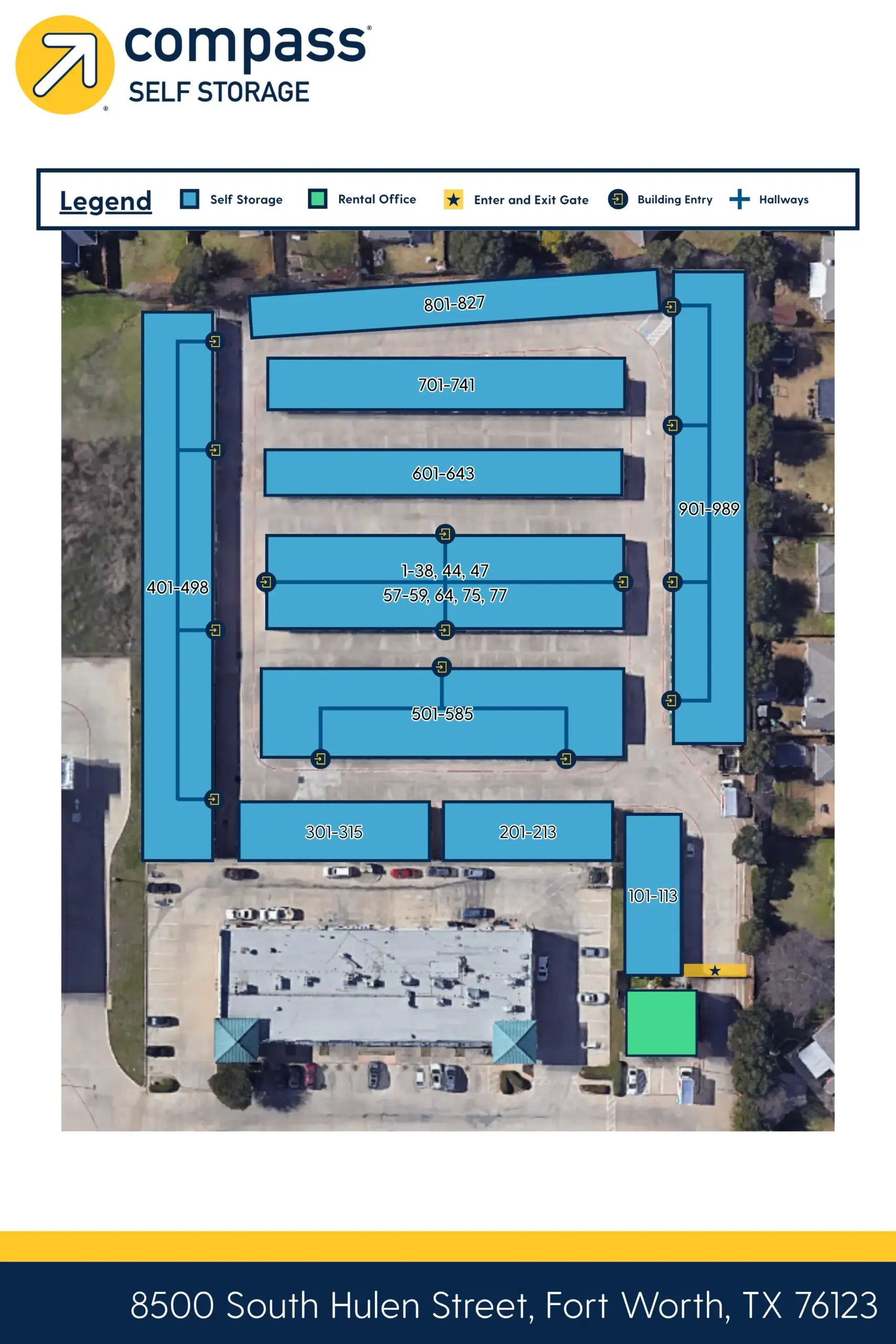 Clear out space in your Fort Worth home or business with Compass Self Storage. If you find your ideal storage solution is currently unavailable at our Hulen Street storage facility, you can find it at one of our other Fort Worth storage facilities: