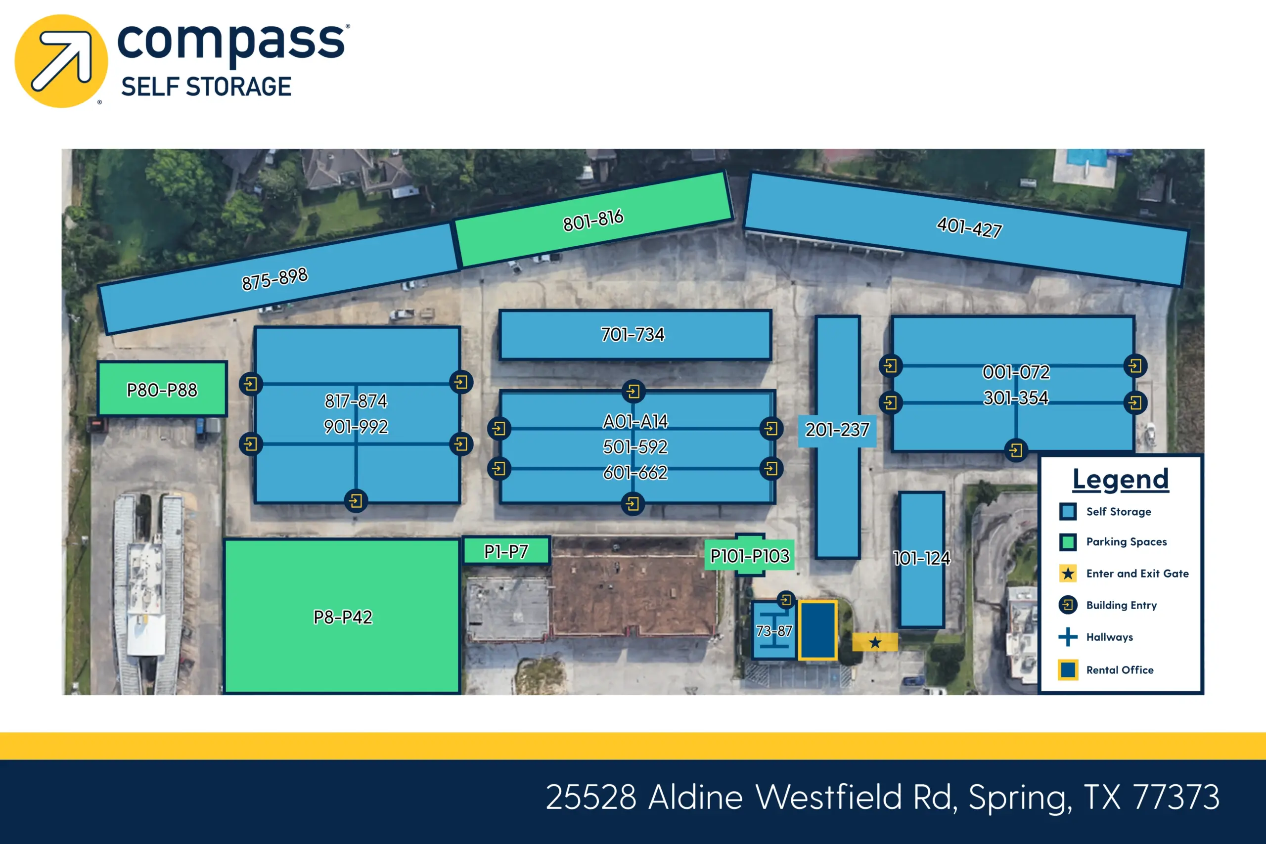 Our hours of access vary by location, so we always recommend giving your local Compass Self Storage team a call for confirmation. At our Spring storage facility on Aldine Westfield Road, you can access your storage unit seven days a week from 6 a.m. to 10 p.m.